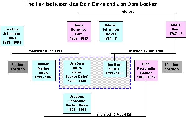 Jan Dam vond als vrouw Ida Sara Köhn. Ongetwijfeld heeft Jan Dam als teken van achting en dank voor zijn pleegouders de naam Backer bij zijn naam behouden. Maar omdat hij zich pas in 1813 Backer Dirks noemde en hij bij de eerste registratie van familie-namen in 1811 de naam Dirks droeg, kregen zijn 4 kinderen later wettelijke bezwaren tegen het voeren van deze naam. Alleen Jacobus Johannes heeft de naam Backer Dirks officieel laten regelen, omdat al zijn examina en aanstellingen op deze naam geregistreed stonden.